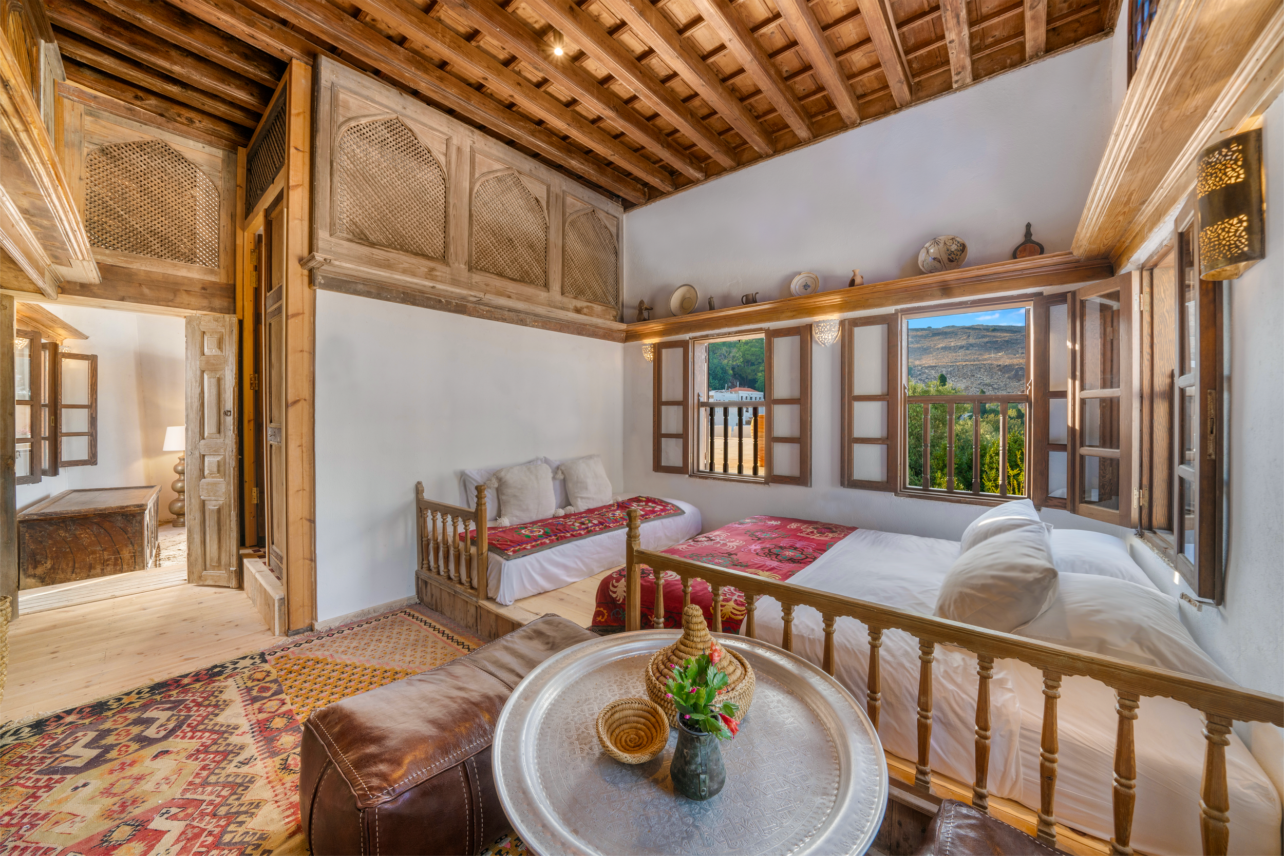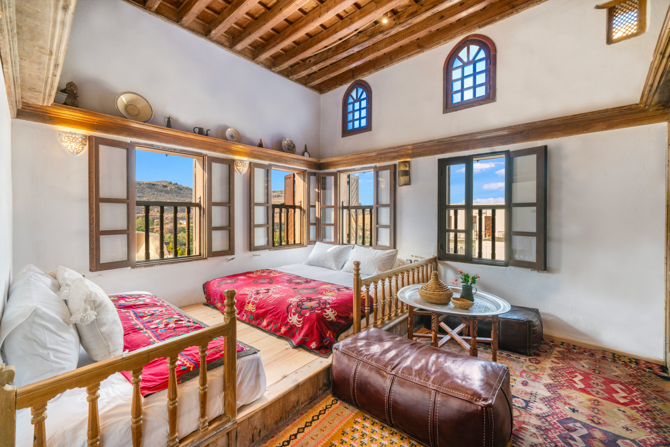 Suite Two, positioned on the upper level of the mansion, accommodates up to five guests across two separate bedrooms, with views toward the beach and a private three-piece bathroom. The master bedroom features a king-size traditional banga bed and a private two-piece washroom, while the adjoining second bedroom offers a single banga bed and may also be arranged as a private sitting room. The suite also includes a separate private library that can host two additional guests, along with a private balcony and terrace that capture the light and rhythm of Lindos village.
