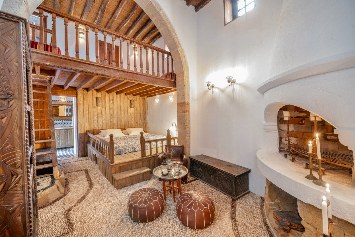 Located in the center of Lindos, and set within the historic fortified walls of Vasilikos Mansion, two private suites provide the rare opportunity to inhabit a fully intact & restored Lindian Captain’s House while enjoying the comfort and discretion of a refined retreat. Authentic architectural elements—stone arches, polished koklakia river pebble floors, handmade glazed tiles, and lime-plastered walls—are paired with natural linen textiles, handcrafted wood and leather furnishings, and artisanal fixtures that reflect the island’s layered Greek and Ottoman heritage.