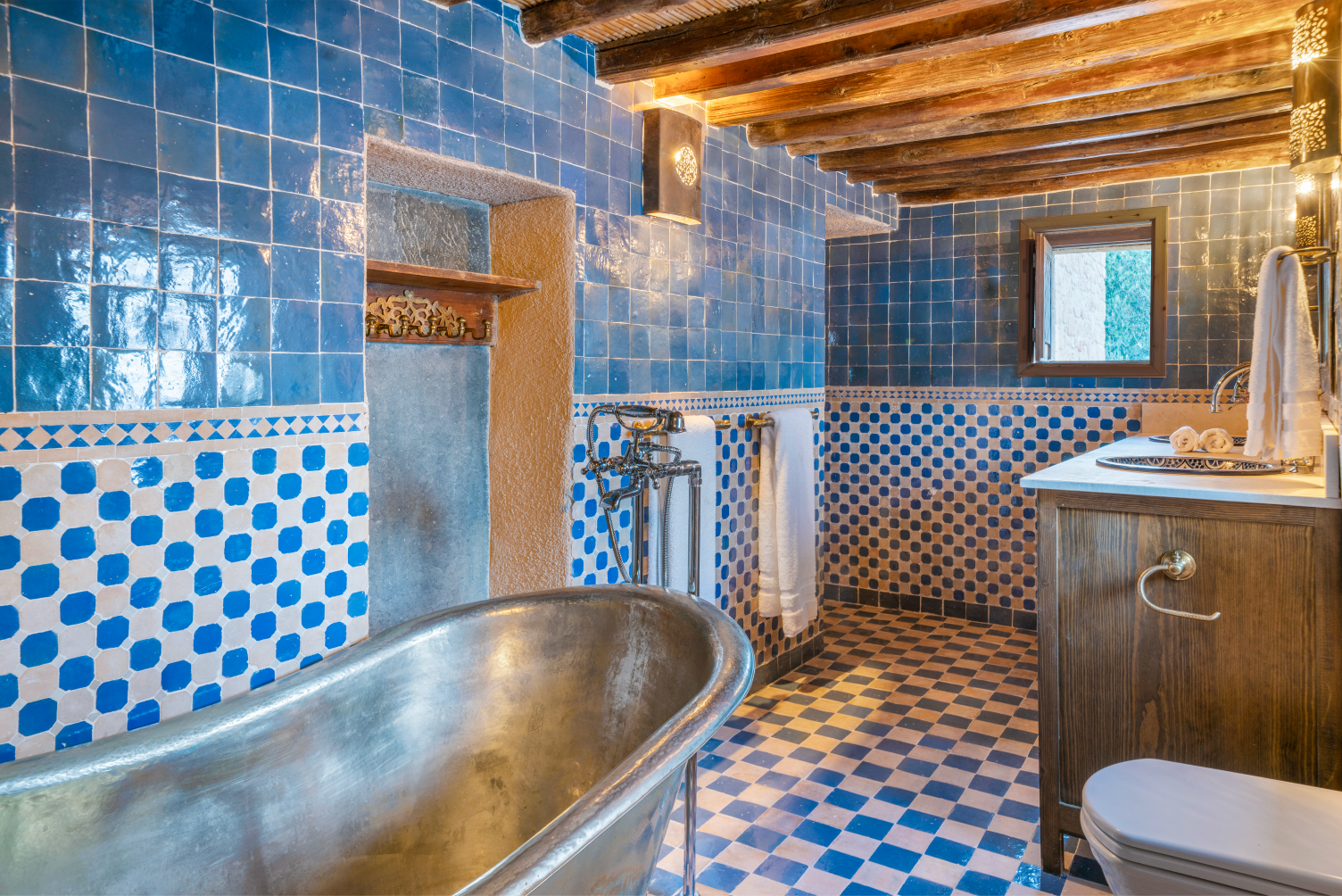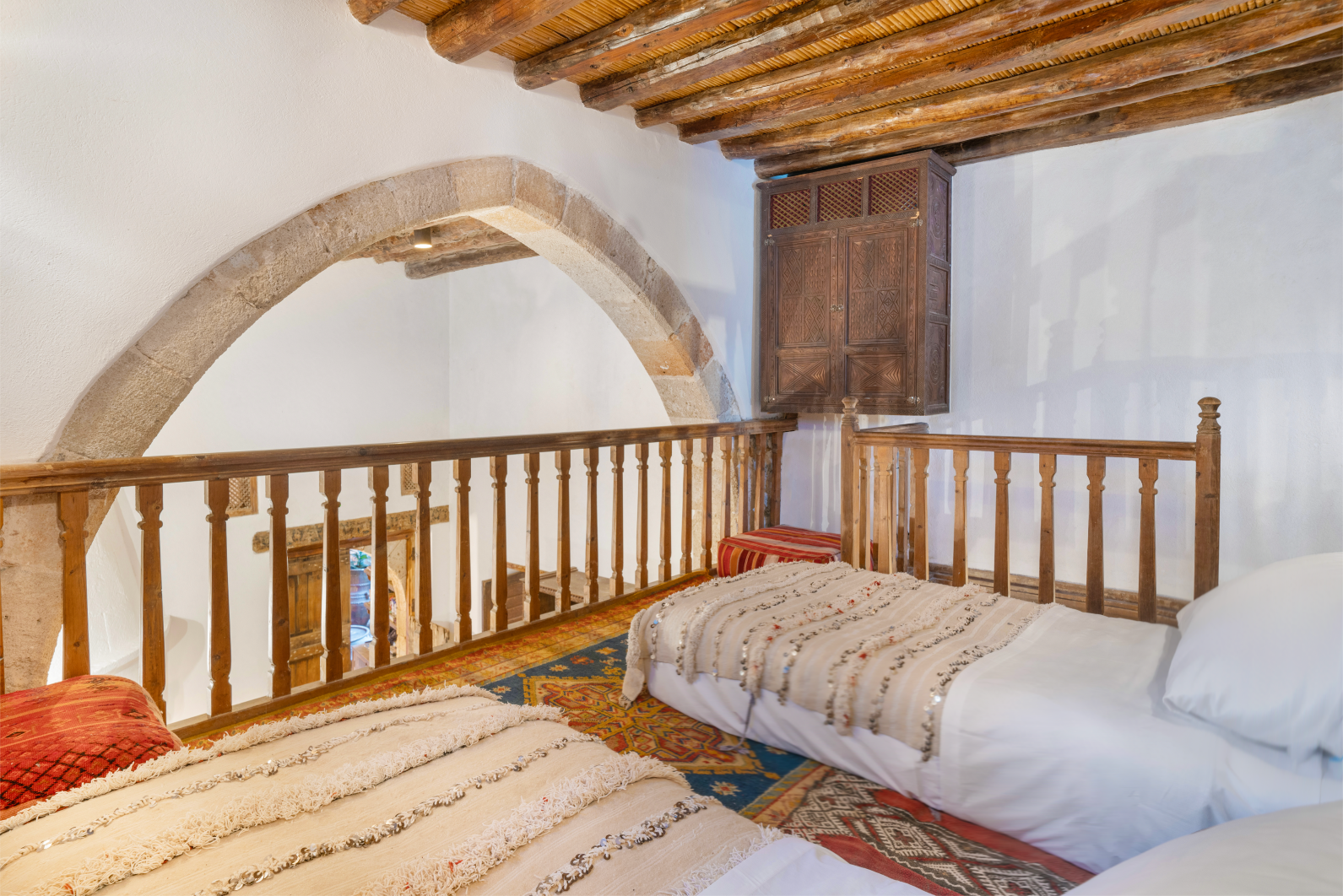 The primary bedroom features a king-size traditional banga bed, an elevated wooden sleeping platform that forms a defining element of historic Greek domestic design. This room includes its own private ensuite and retains the quiet elegance of the mansion’s original materials and craftsmanship. Above, a loft-style second bedroom provides an additional sleeping space with its own four-piece ensuite, offering privacy and comfort for families or close friends traveling together.