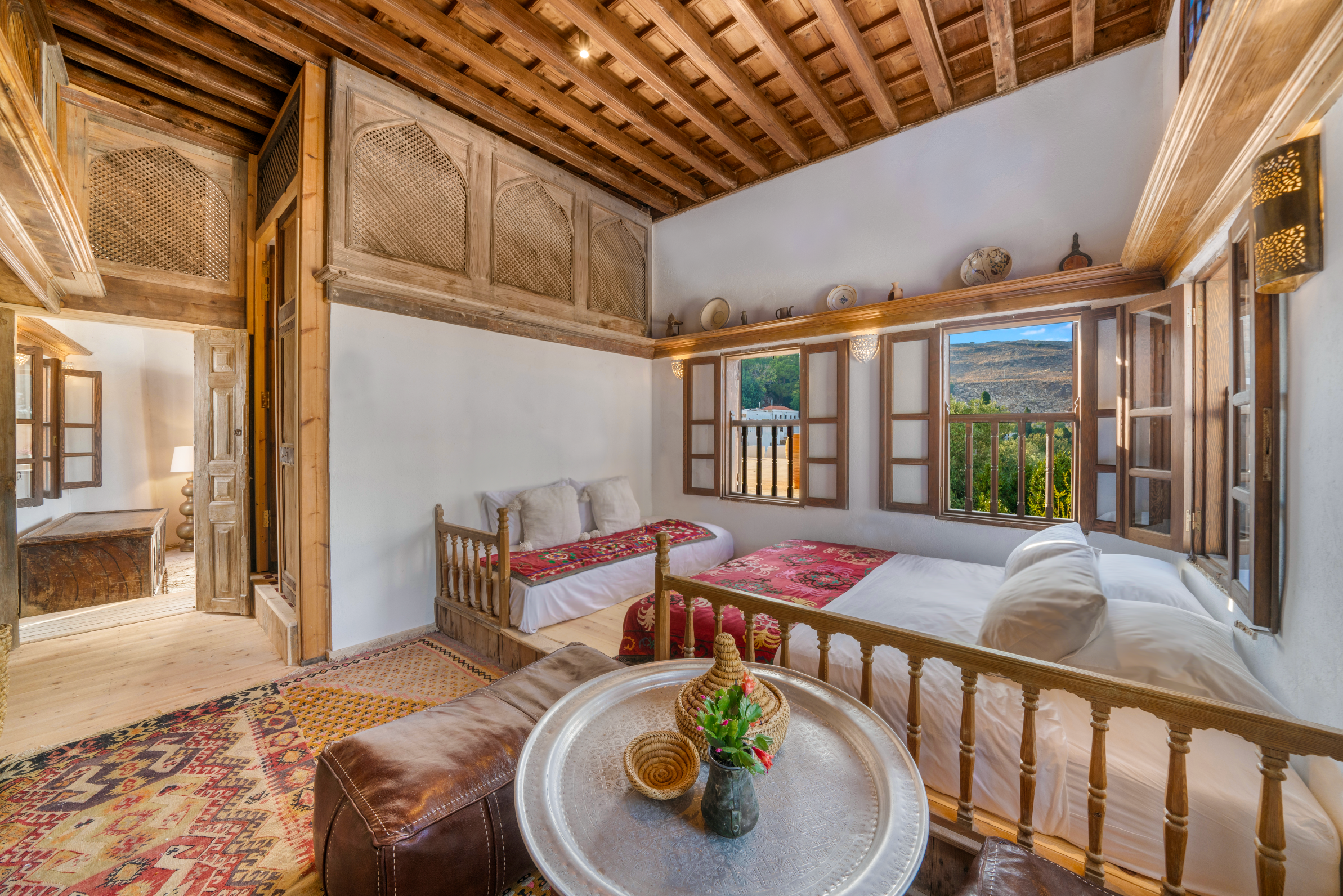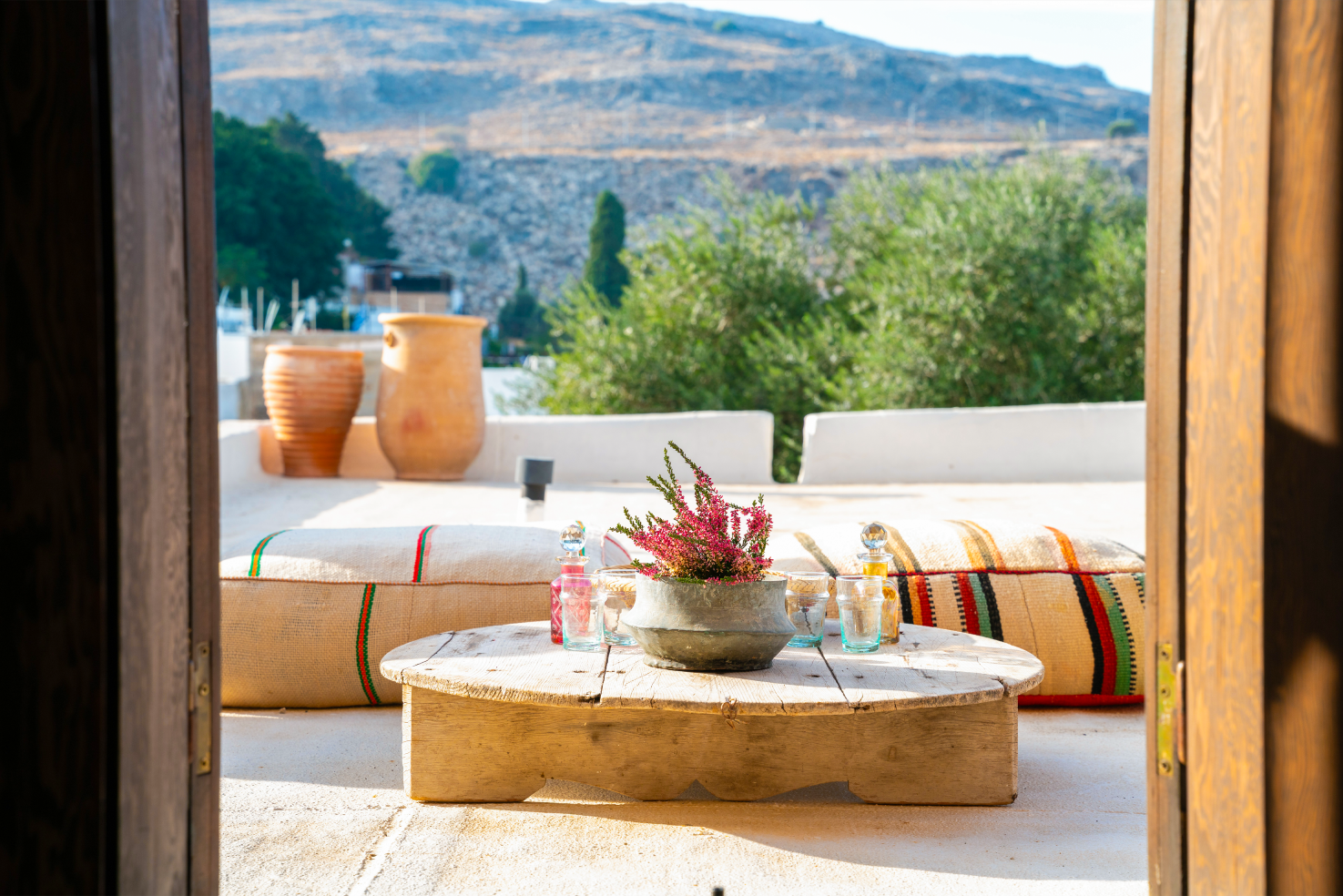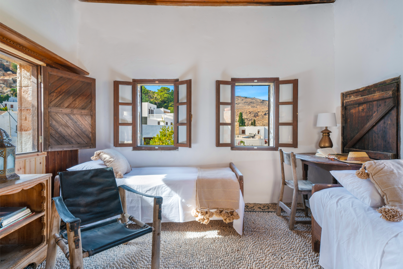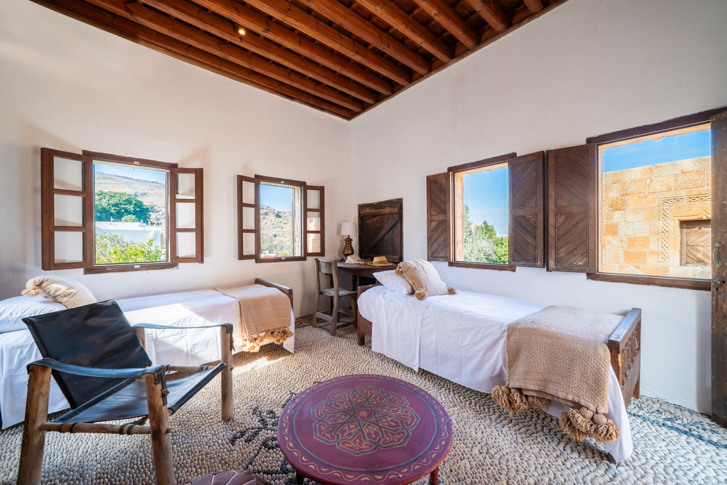 Positioned on the upper level of Vasilikos Mansion, Suite Two offers a bright and spacious retreat accommodating up to five guests across two separate bedrooms, with views stretching toward the beach and the whitewashed rooftops of Lindos. Elevated within the historic house, the suite enjoys an airy atmosphere shaped by traditional timber ceilings, natural light, and the calm rhythm of village life below.