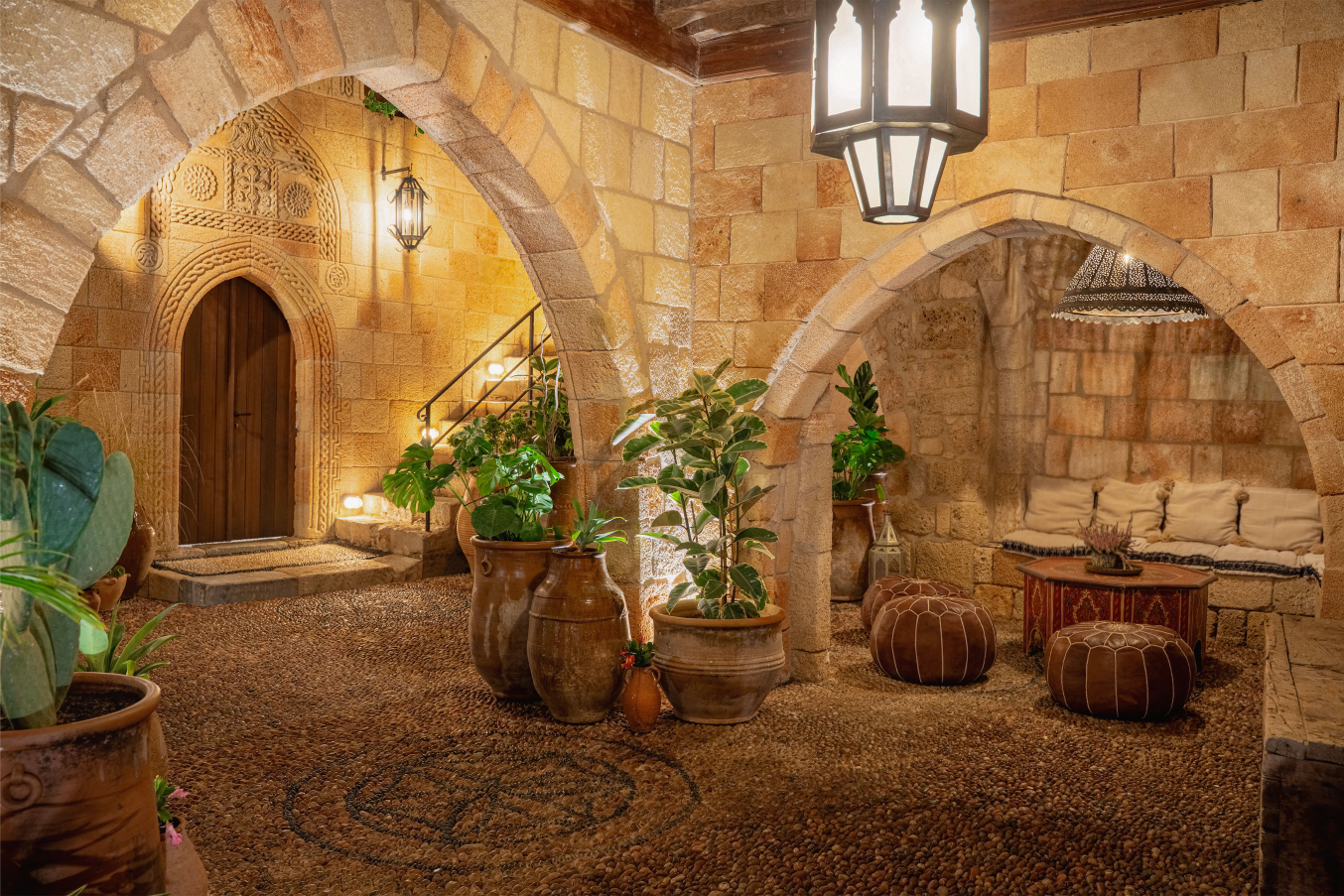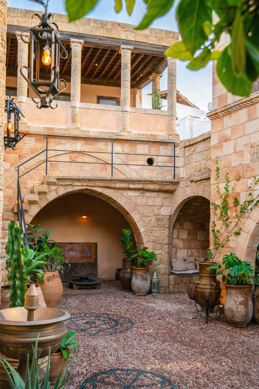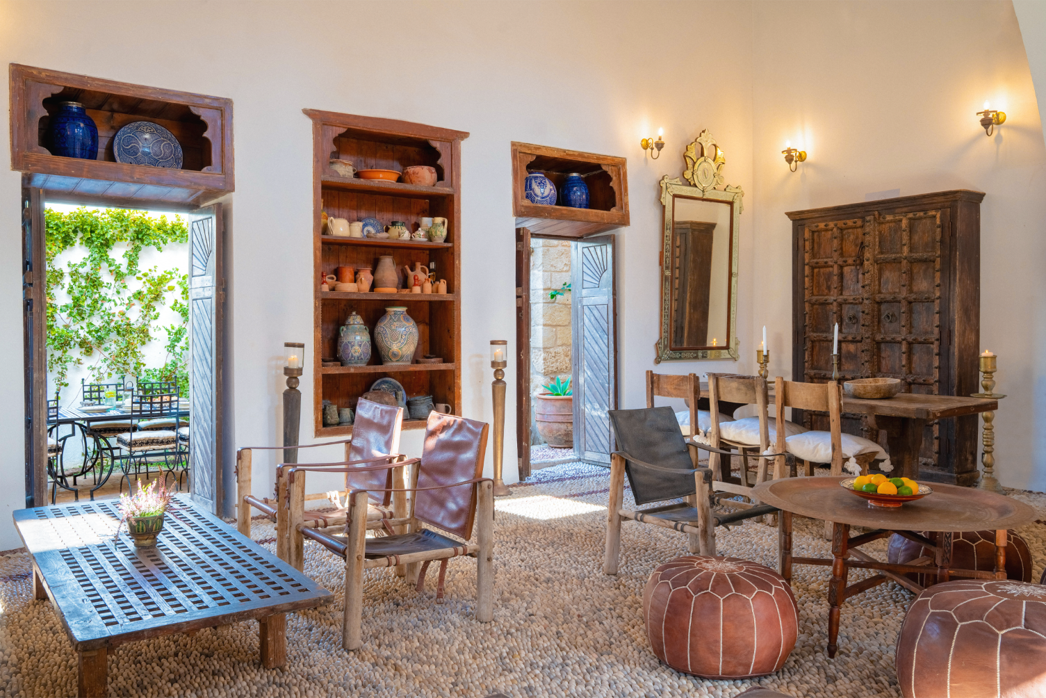 Suite Two also includes a separate private library, which can comfortably accommodate two additional guests, creating a quiet retreat within the suite itself. Outside, a private balcony and terrace capture the light, sea breezes, and gentle movement of Lindos village, offering a peaceful setting for morning coffee or evening relaxation above the courtyards and gardens of the mansion.