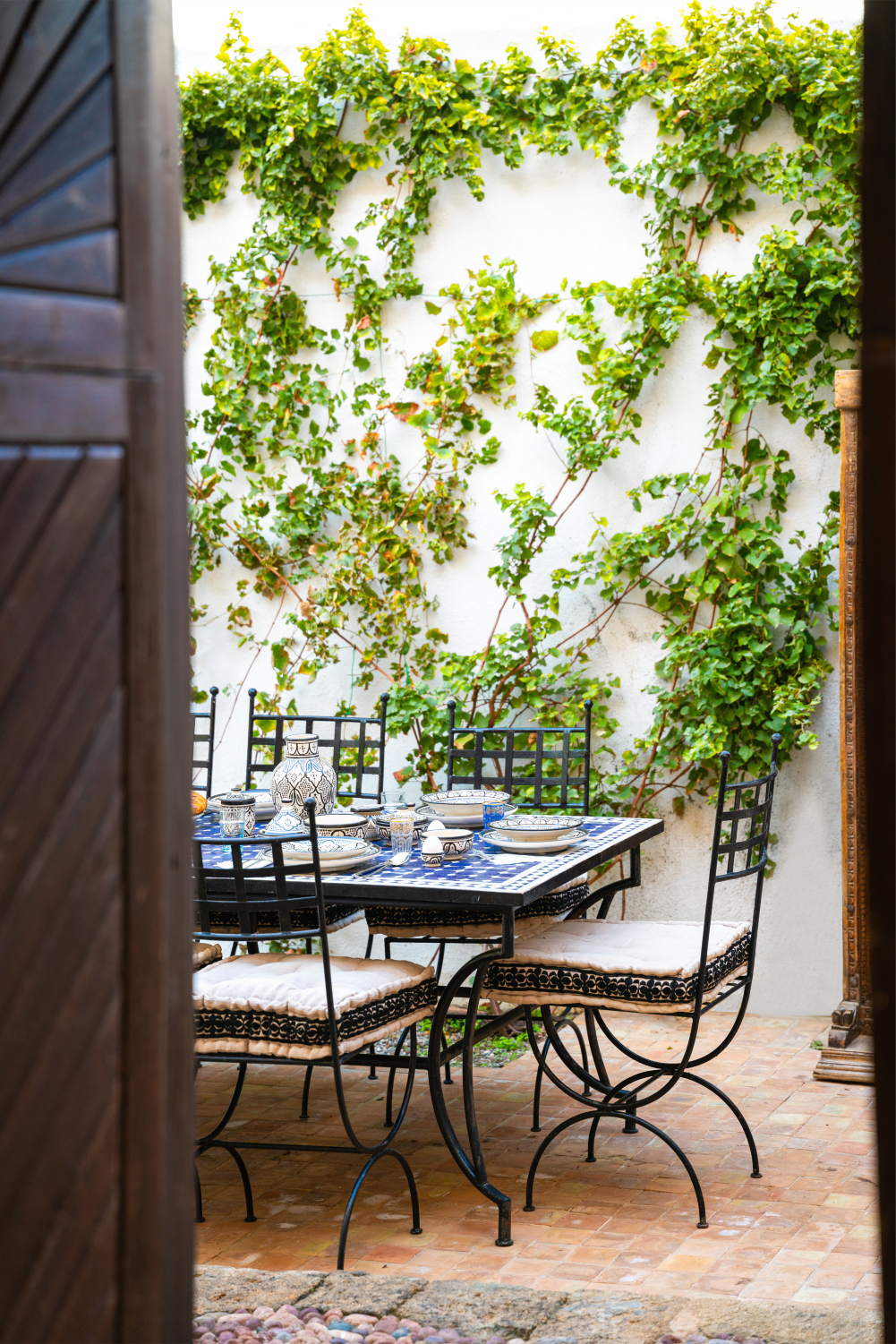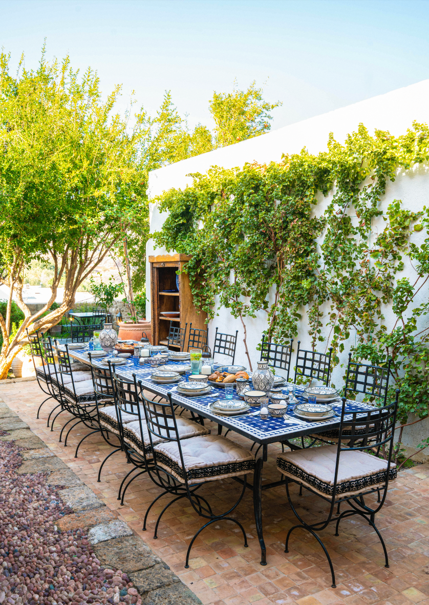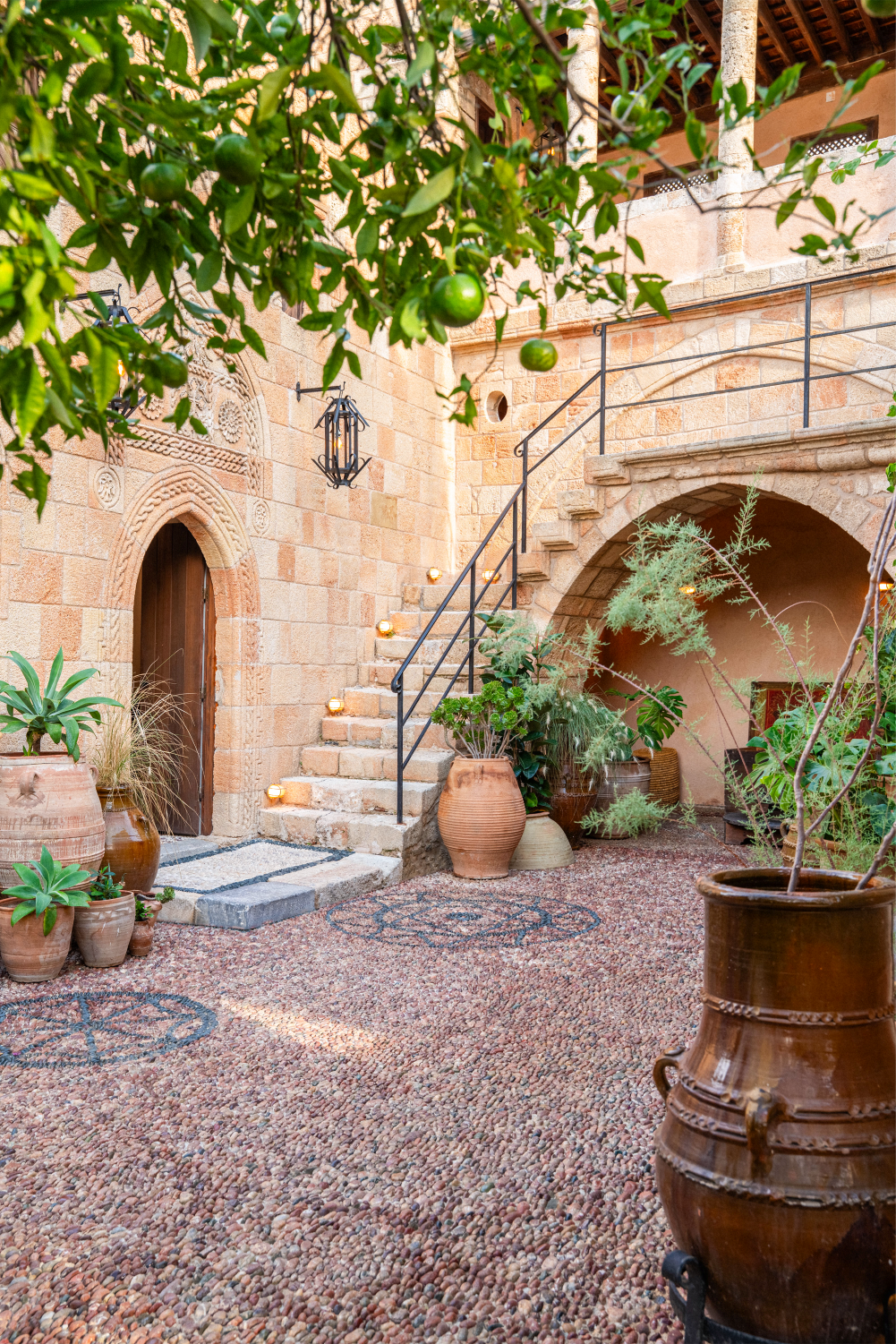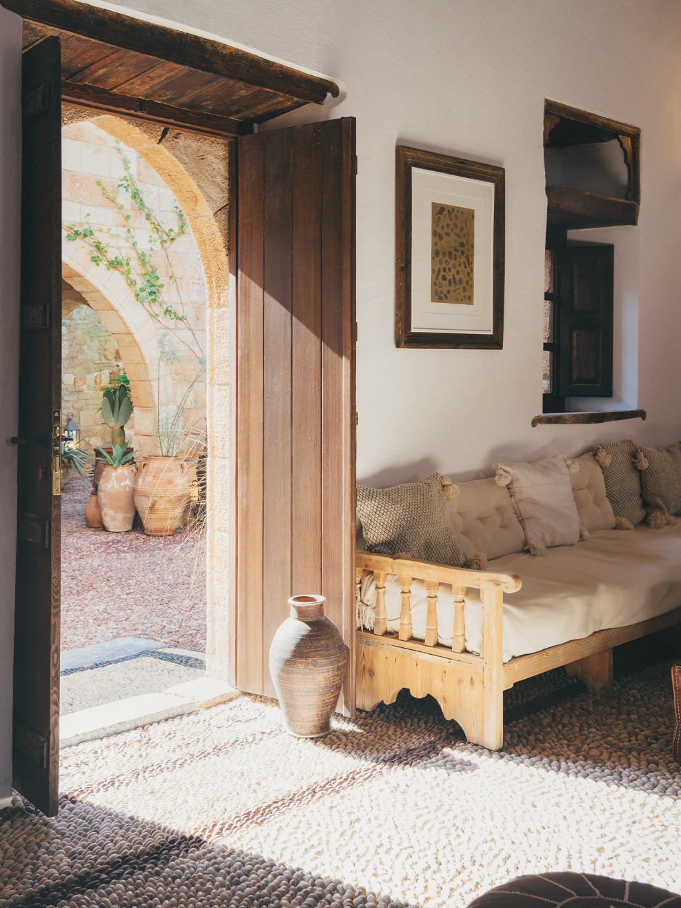 Suite Two also includes a separate private library, which can comfortably accommodate two additional guests, creating a quiet retreat within the suite itself. Outside, a private balcony and terrace capture the light, sea breezes, and gentle movement of Lindos village, offering a peaceful setting for morning coffee or evening relaxation above the courtyards and gardens of the mansion.