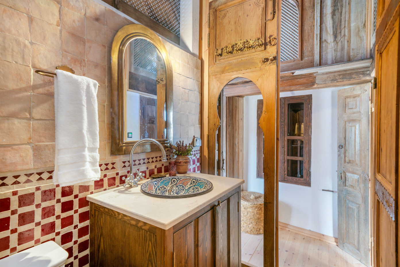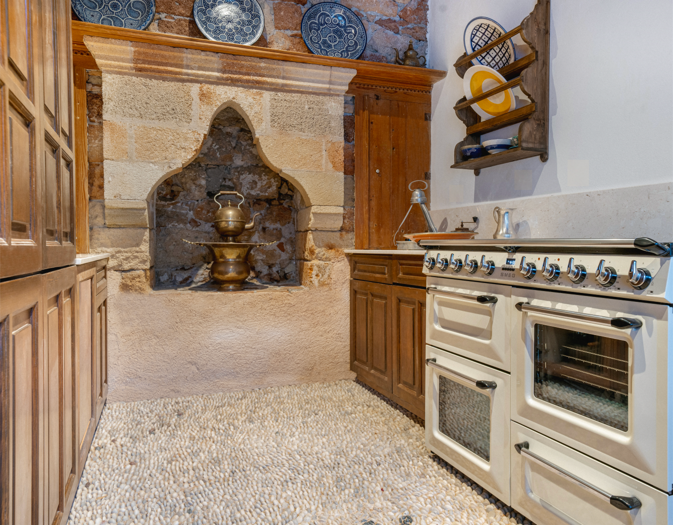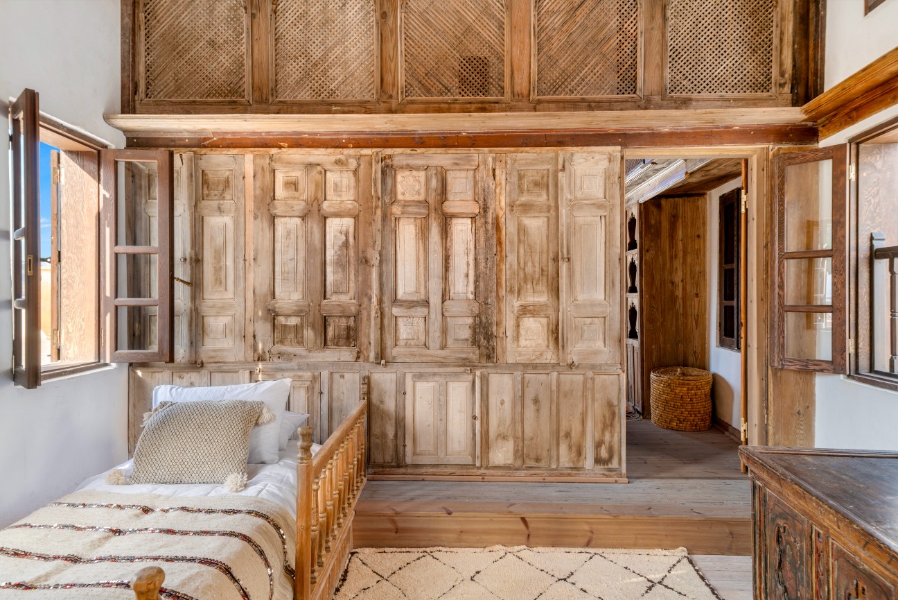 The master bedroom features a king-size traditional banga bed, an elevated wooden sleeping platform characteristic of historic Greek homes, along with its own private two-piece washroom. An adjoining second bedroom offers a single traditional banga bed and may also be arranged as a private sitting room, providing flexibility for families or guests seeking additional living space.